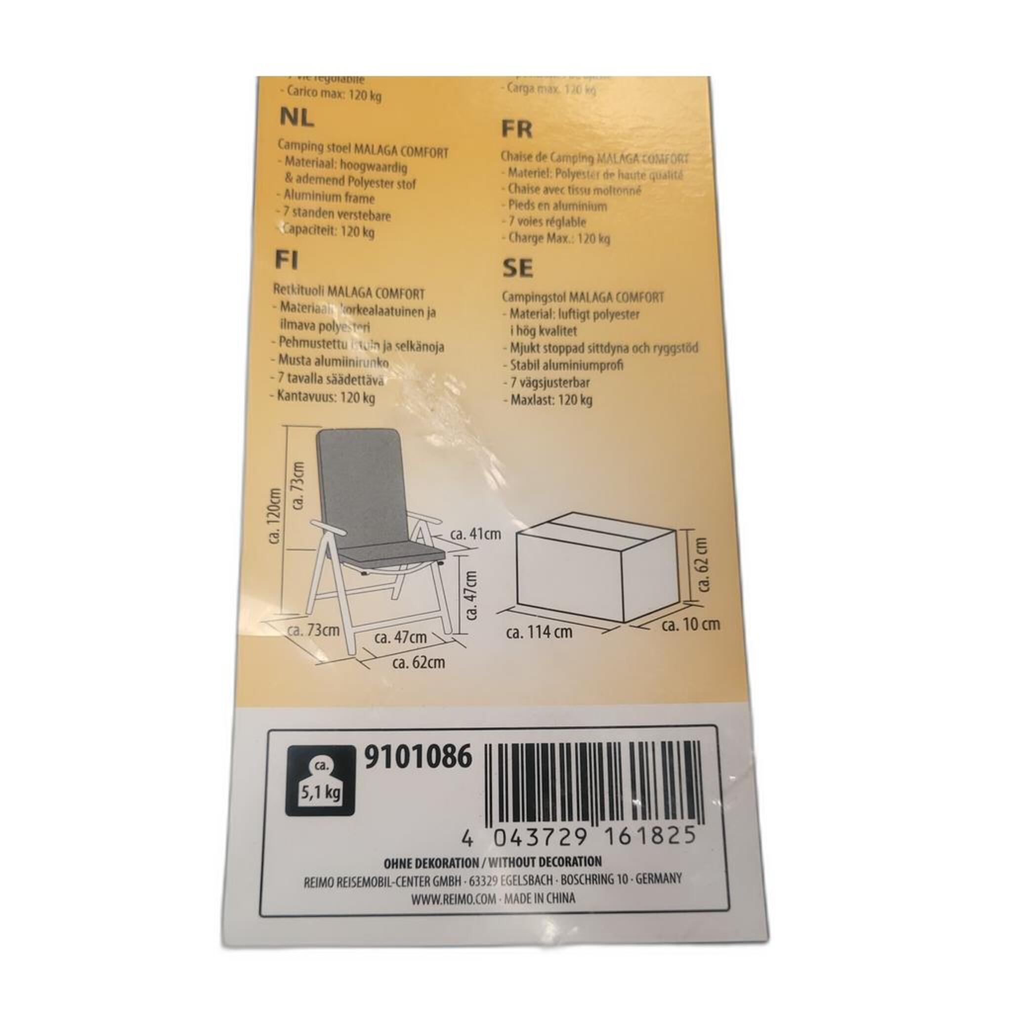 Die Maße des Camp4 Klappstuhls Malaga Comfort betragen 62 x 120 x 73 cm im aufgebauten Zustand, während das Packmaß bei 114 x 62 x 10 cm liegt. Mit einem Gewicht von nur 5,1 kg lässt sich der Stuhl problemlos transportieren und überallhin mitnehmen.