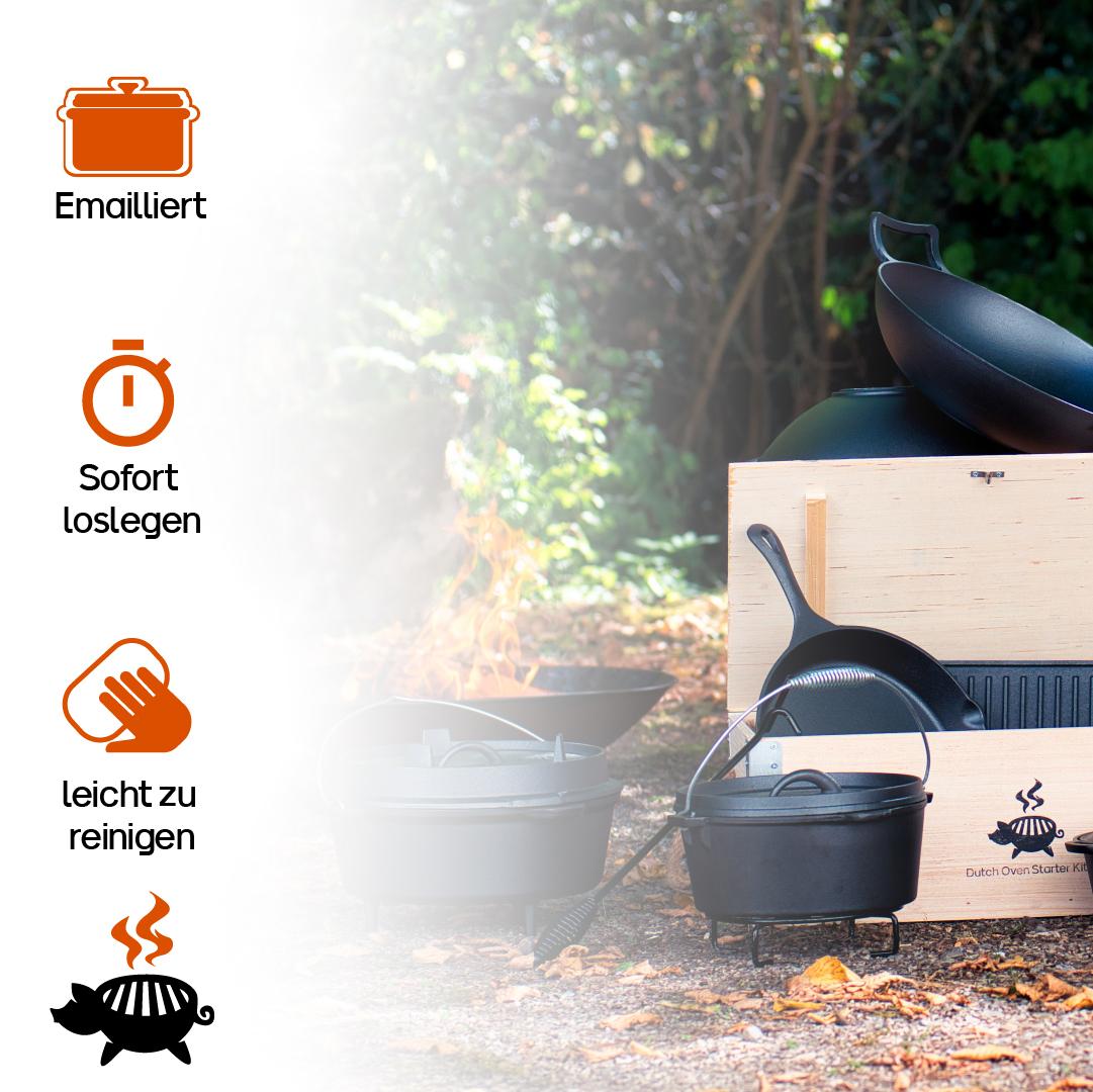 Mit dem Grillschweine Dutch Oven Emailliert 5L ist das Kochen und Backen, das Schmoren und Grillen, keine Herausforderung mehr und jeder kann hiermit im Handumdrehen leckere Gerichte zubereiten. Und dank der einfachen Handhabung und der unproblematischen Reinigung gibt es auch beim Abwasch kein böses Erwachen. So ist der Dutch Oven die perfekte Ergänzung für Kochprofis wie auch Kochanfänger.