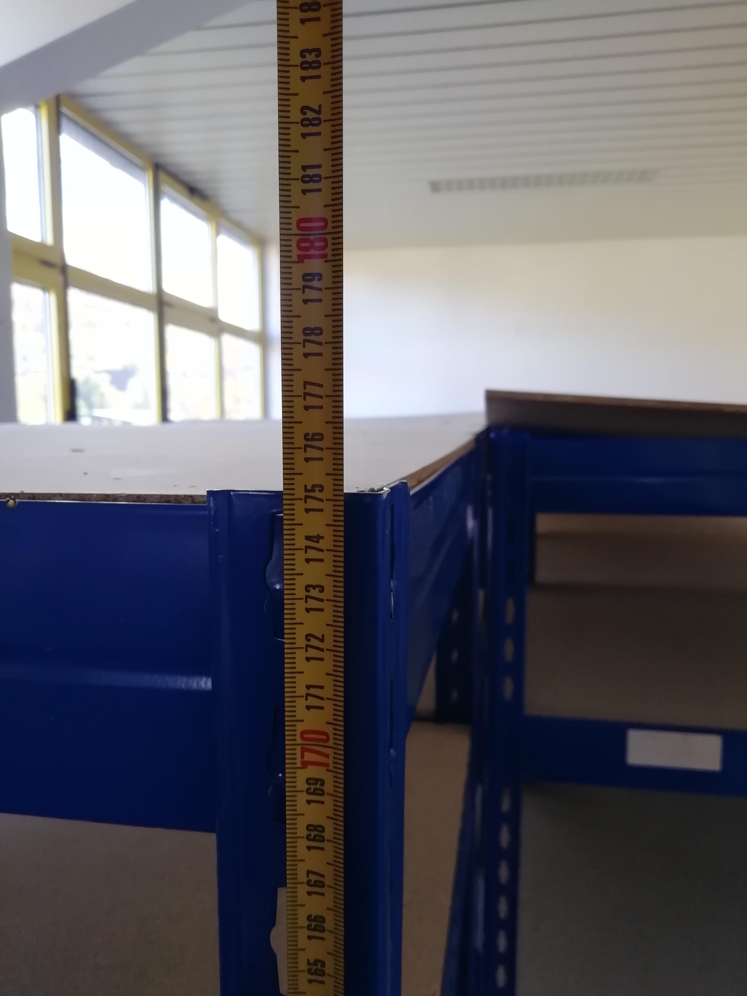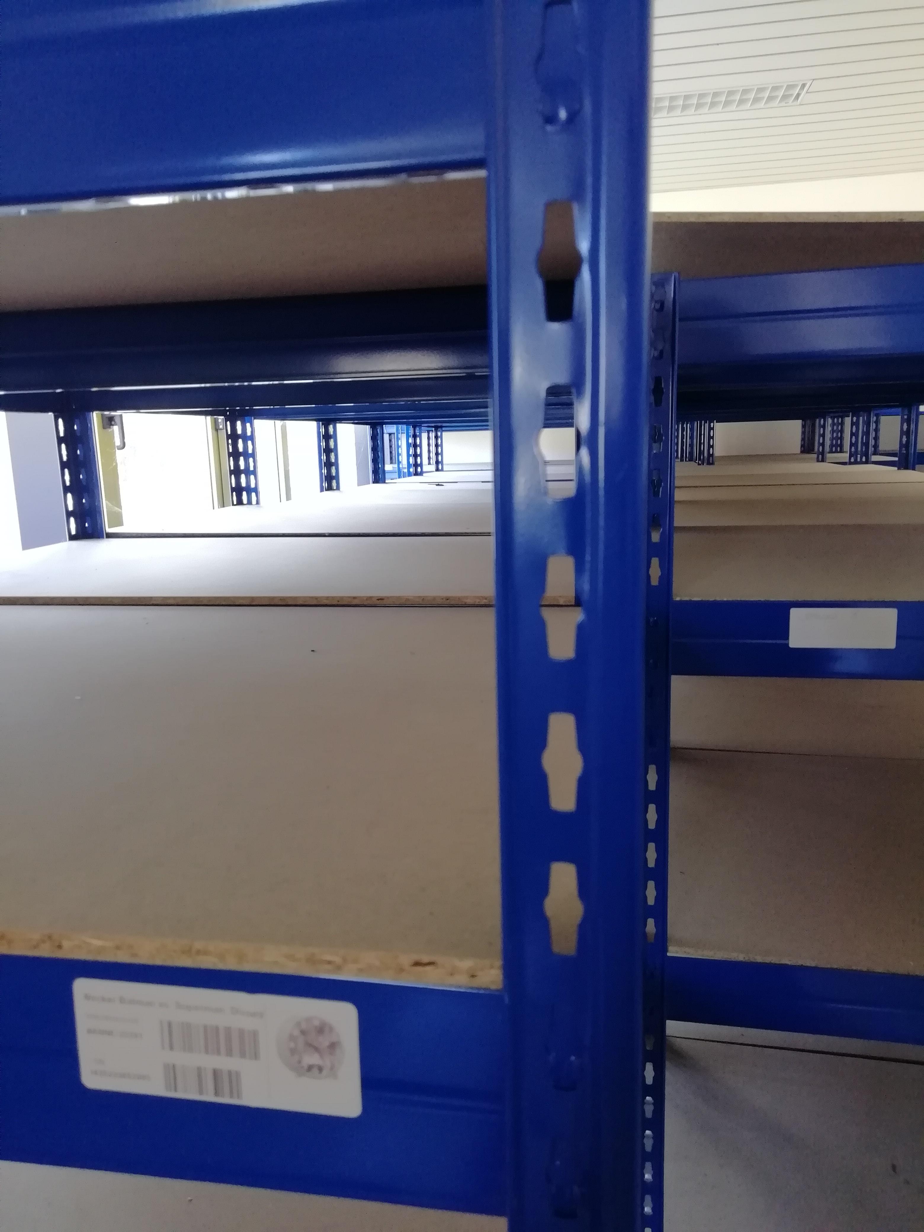 Die Regale werden ohne schwarze Plastikkappen (Füße) angeboten. Es handelt sich um gebrauchte Regale, die bereits mit Aufklebern belabelt sind. Gebrauchsspuren können vorhanden sein, die Funktionalität ist jedoch gegeben.